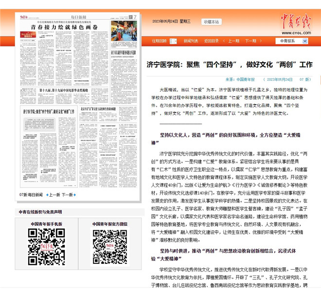 5月24日,《中国青年报》刊发我校文化“两创”工作成果文章《济宁医学院:聚焦“四个坚持”,做好文化“两创”工作》。文章从坚持以文化人,营造“两创”的良好氛围和环境,全方位塑造“大爱精神”;坚持与时俱进,推动“两创”与思想政治教育创新相结合,沉浸式体验“大爱精神”;坚持守正创新,推进“两创”工作创新发展,创新性发展“大爱精神”;坚持立德树人,落实“两创”工作走深走实,“大爱精神”花开遍地四个方面全面介绍了我校建校70年来,凝练教育特色,打造文化品牌,聚焦“四个坚持”,做好文化“两创”工作,逐渐形成了以“大爱”为特色的济医文化的工作成果。