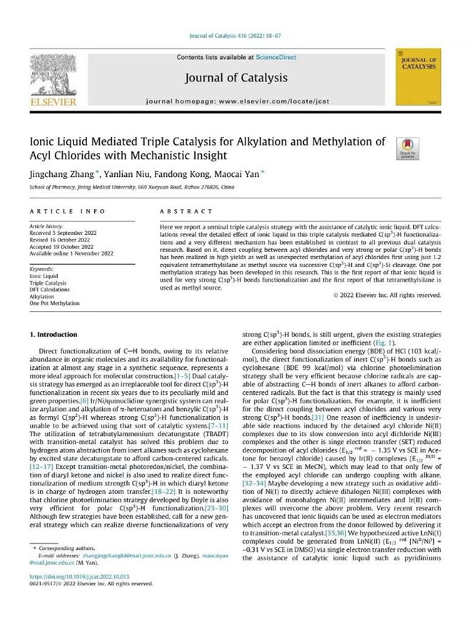 张京昌博士多年来一直从事于可见光介导双催化体系下sp3碳氢键功能化研究,在该研究领域具有较深的造诣,并于2022年在国际Top期刊《Journal of Catalysis》(影响因子8.05)发表了相关研究论文。该研究论文与本论文一脉相承,属于同一研究领域。